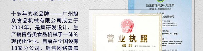 廣州旭眾食品機(jī)械有限公司是一家集科研開(kāi)發(fā),生產(chǎn)設(shè)計(jì),營(yíng)銷(xiāo)服務(wù)為一體的現(xiàn)代化生產(chǎn)企業(yè)?,F(xiàn)代化生產(chǎn)車(chē)間,精湛制造技術(shù),所產(chǎn)機(jī)械歷經(jīng)市場(chǎng)重重考驗(yàn),不斷贏得海內(nèi)外客戶(hù)的贊譽(yù)。