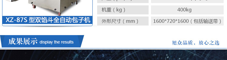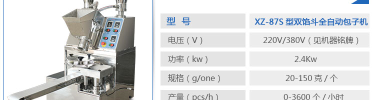XZ-87S型雙餡斗全自動(dòng)包子機(jī),可生產(chǎn)各種肉包、肉菜包、菜包、小籠包、湯包、水晶包、圓饅頭、奶黃包、豆沙包、叉燒包、南瓜餅等幾十種包餡制品。適用于賓館、飯店、學(xué)校、機(jī)關(guān)企業(yè)食堂、饅頭或包子加工廠、早餐工程店及速凍食品廠等單位??蓾M(mǎn)足不同客戶(hù)群體。免費(fèi)提供工藝技術(shù)。免費(fèi)上門(mén)培訓(xùn)指導(dǎo)安裝。