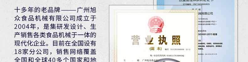廣州旭眾食品機(jī)械有限公司是一家集科研開發(fā),生產(chǎn)設(shè)計(jì),營銷服務(wù)為一體的現(xiàn)代化生產(chǎn)企業(yè)?,F(xiàn)代化生產(chǎn)車間,精湛制造技術(shù),所產(chǎn)機(jī)械歷經(jīng)市場重重考驗(yàn),不斷贏得海內(nèi)外客戶的贊譽(yù)。