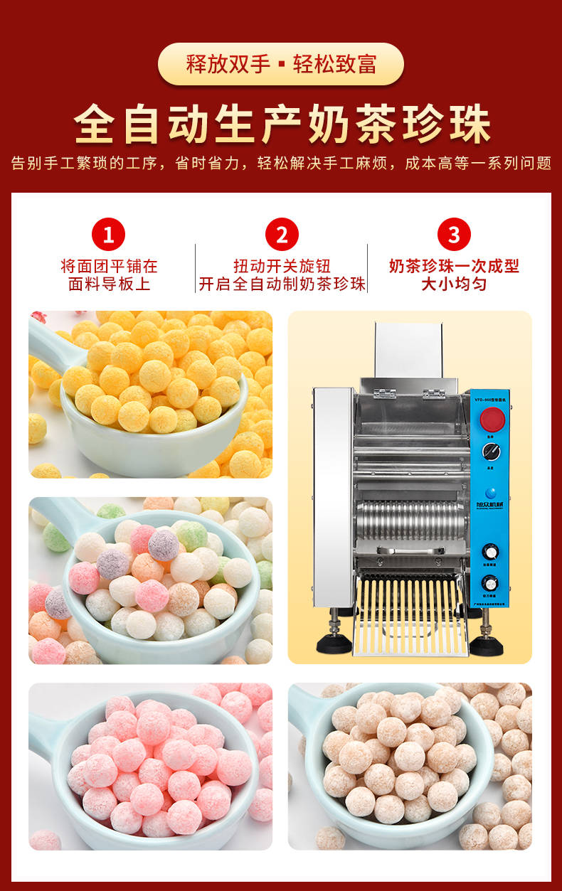 VFD-900珍珠奶茶機,奶茶店、甜品店可用??缮a(chǎn)奶茶珍珠,果蔬圓子,無餡湯圓,水晶湯圓,各種芋圓。不占空間、體積小、重量輕,桌面上的小奶茶珍珠機。告別手工繁瑣的工序,省時省力,輕松解決手工麻煩,成本高等一系列問題