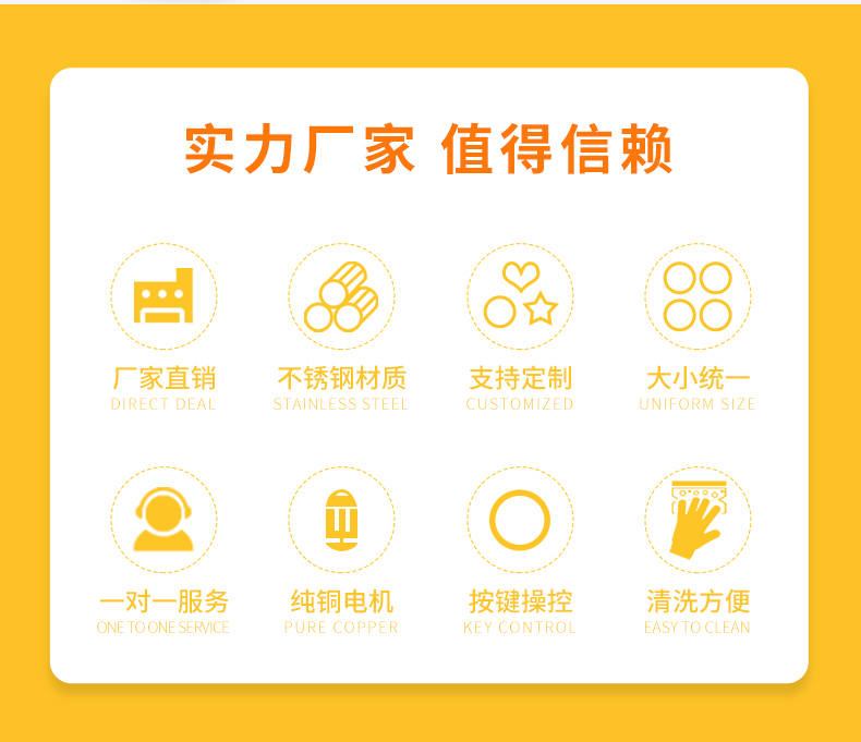 廣州旭眾食品機械有限公司是一家集科研開發(fā),生產(chǎn)設(shè)計,營銷服務(wù)為一體的現(xiàn)代化生產(chǎn)企業(yè)?,F(xiàn)代化生產(chǎn)車間,精湛制造技術(shù),所產(chǎn)機械歷經(jīng)市場重重考驗,不斷贏得海內(nèi)外客戶的贊譽。