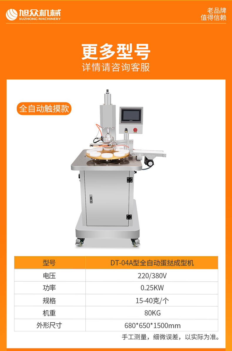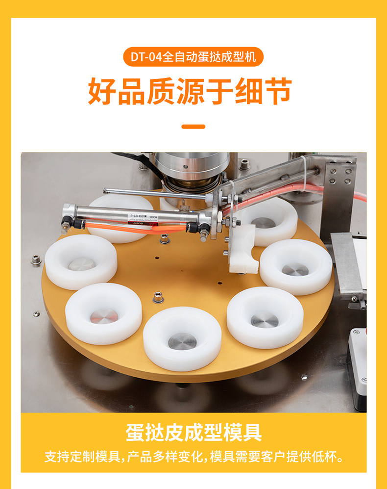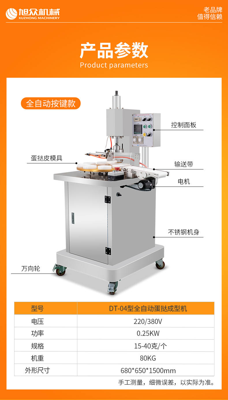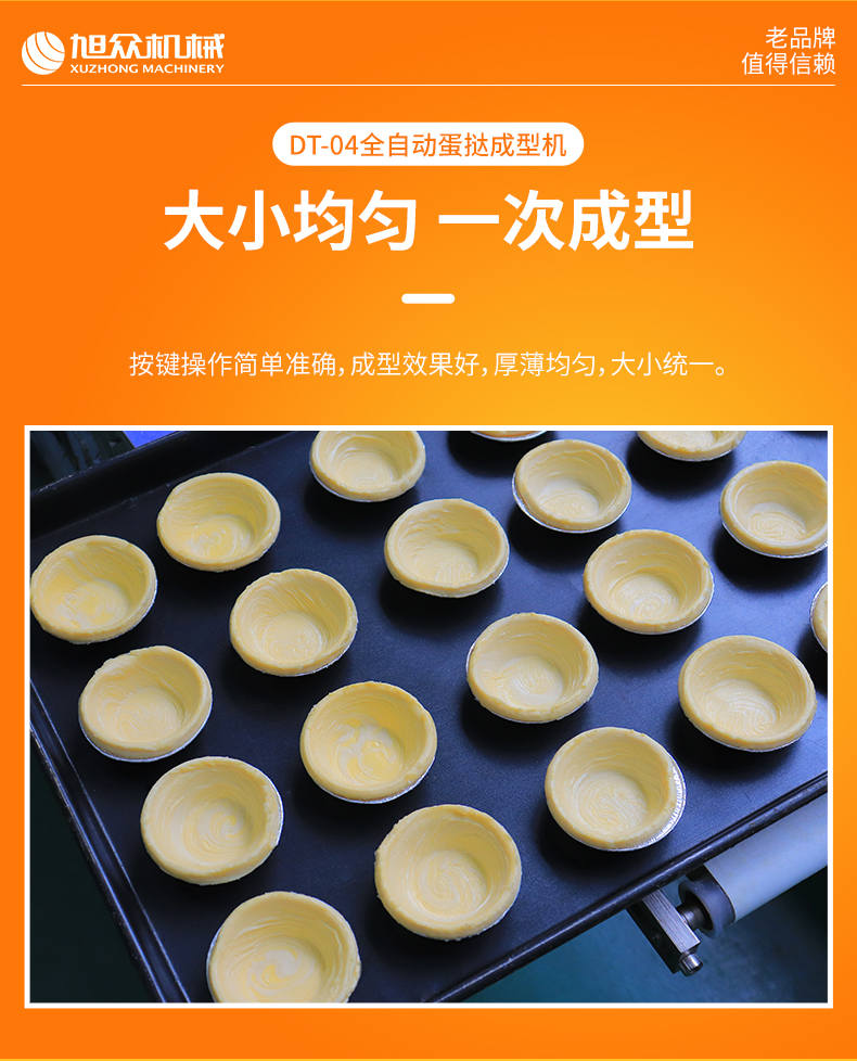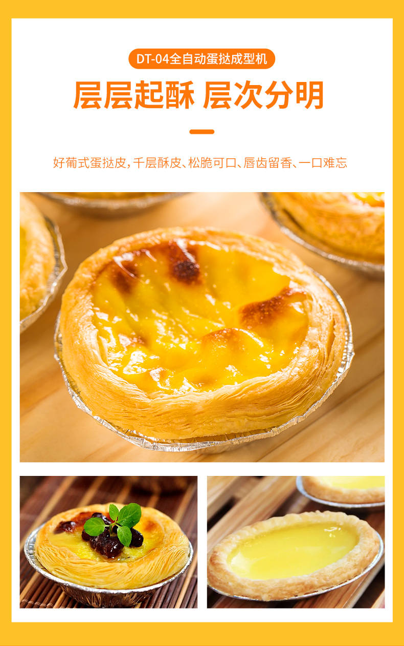 DT-04全自動蛋撻成型機,2-3秒快速成型。該機應(yīng)用于傳統(tǒng)蛋撻、葡式蛋撻及其它須印型之產(chǎn)品突破傳統(tǒng)用手捏,采用微電子控制成型,一個2-3秒,高效率。大小均勻一次成型按鍵操作簡單準確,成型效果好,厚薄均勻,大小統(tǒng)-。層層起酥層次分明好葡式蛋撻皮,千層酥皮、松脆可口、唇齒留香、一口難忘。