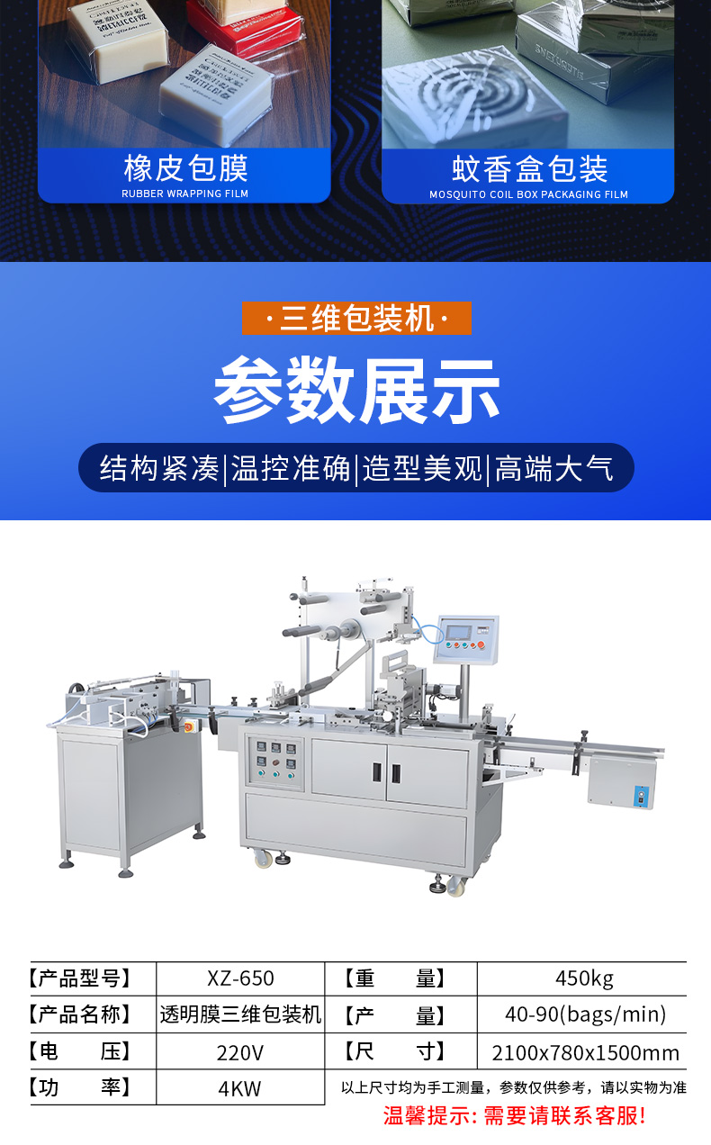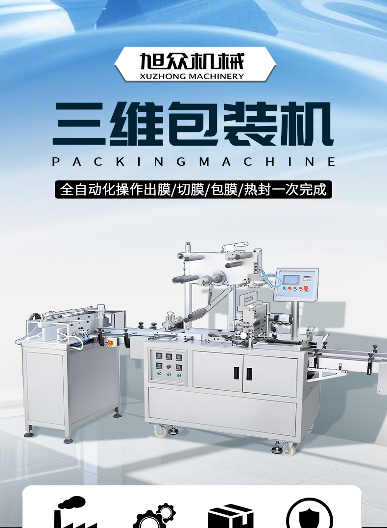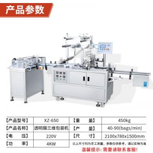 XZ-650包裝機(jī),三維包裝機(jī),全自動(dòng)化操作出膜、切膜、包膜、熱封一次完成??蓮V泛應(yīng)用多種產(chǎn)品,適用包裝的產(chǎn)品有食品、撲克牌、香煙盒化妝品、日用品、文具用品等類型產(chǎn)品。