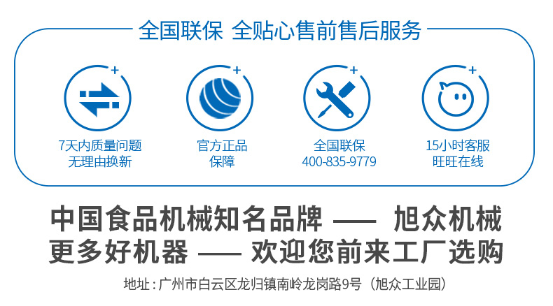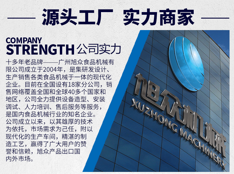 廣州旭眾食品機(jī)械有限公司是一家集科研開發(fā),生產(chǎn)設(shè)計(jì),營銷服務(wù)為一體的現(xiàn)代化生產(chǎn)企業(yè)?,F(xiàn)代化生產(chǎn)車間,精湛制造技術(shù),所產(chǎn)機(jī)械歷經(jīng)市場重重考驗(yàn),不斷贏得海內(nèi)外客戶的贊譽(yù)。