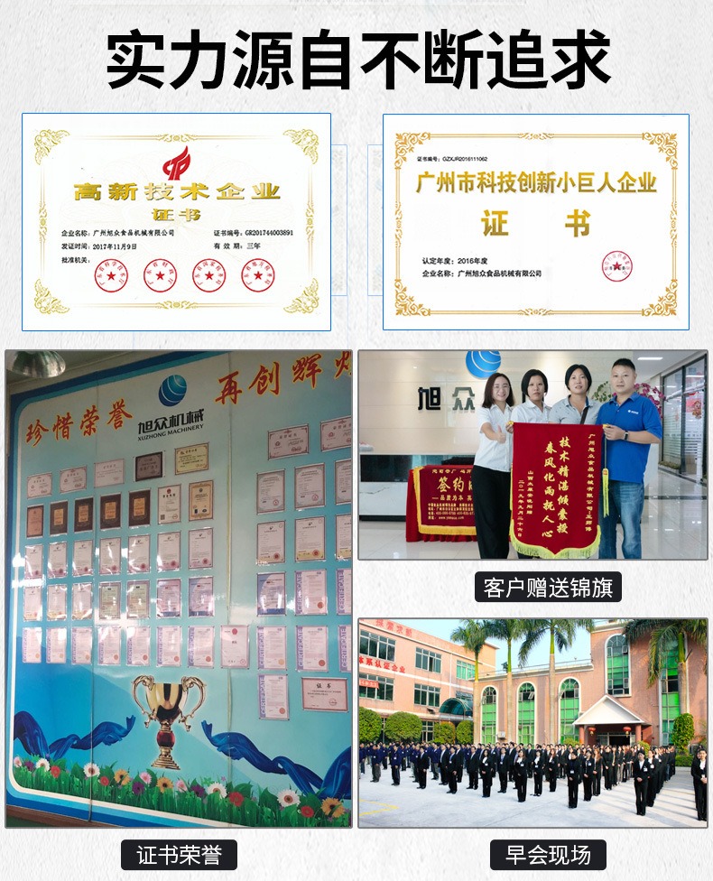 廣州旭眾食品機(jī)械有限公司是一家集科研開(kāi)發(fā),生產(chǎn)設(shè)計(jì),營(yíng)銷(xiāo)服務(wù)為一體的現(xiàn)代化生產(chǎn)企業(yè)?,F(xiàn)代化生產(chǎn)車(chē)間,精湛制造技術(shù),所產(chǎn)機(jī)械歷經(jīng)市場(chǎng)重重考驗(yàn),不斷贏得海內(nèi)外客戶(hù)的贊譽(yù)。