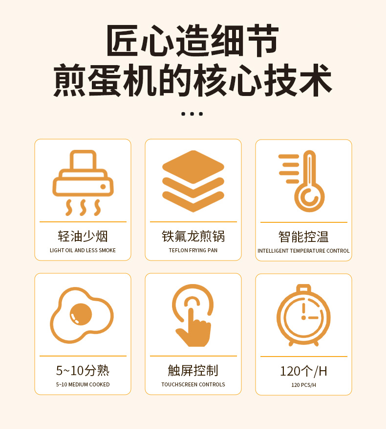 商用全自動智能煎蛋機(jī),匠心造細(xì)節(jié)煎蛋機(jī)的核心技術(shù),輕油少煙、5~10分熟、鐵氟龍煎鍋、觸屏控制、智能控溫。口味個性化五分/七分/十分熟,智能控溫上下鍋恒溫煎烤。