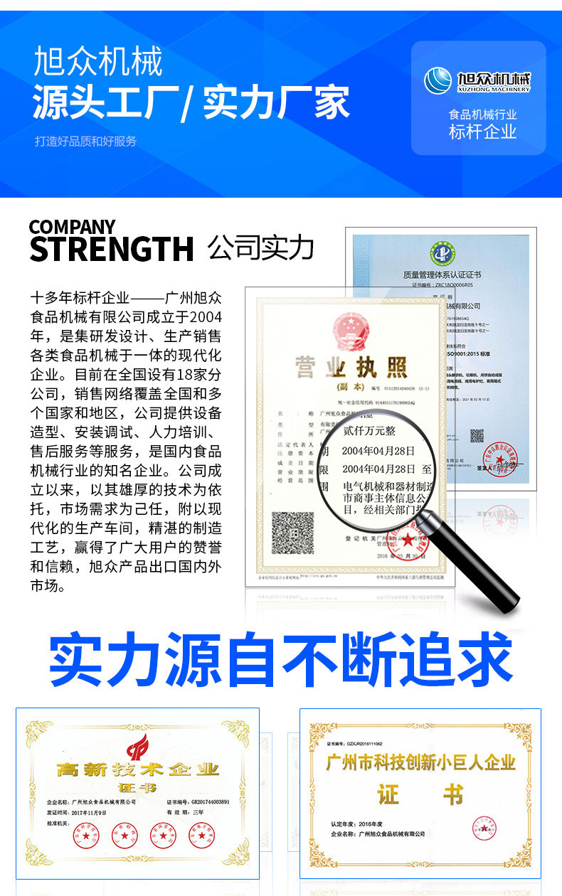 廣州旭眾食品機(jī)械有限公司是一家集科研開發(fā),生產(chǎn)設(shè)計(jì),營銷服務(wù)為一體的現(xiàn)代化生產(chǎn)企業(yè)?,F(xiàn)代化生產(chǎn)車間,精湛制造技術(shù),所產(chǎn)機(jī)械歷經(jīng)市場重重考驗(yàn),不斷贏得海內(nèi)外客戶的贊譽(yù)。