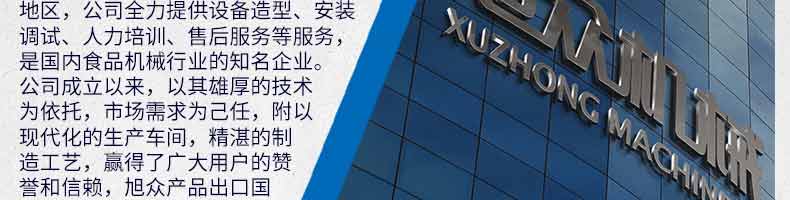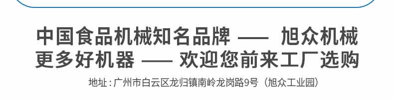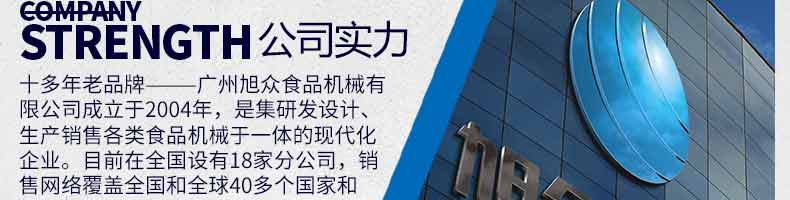 廣州旭眾食品機械有限公司是一家集科研開發(fā),生產(chǎn)設(shè)計,營銷服務(wù)為一體的現(xiàn)代化生產(chǎn)企業(yè)?,F(xiàn)代化生產(chǎn)車間,精湛制造技術(shù),所產(chǎn)機械歷經(jīng)市場重重考驗,不斷贏得海內(nèi)外客戶的贊譽。