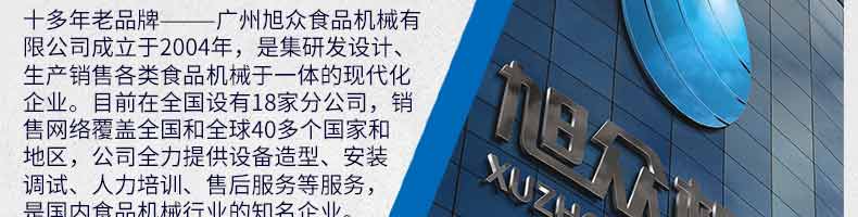 廣州旭眾食品機(jī)械有限公司是一家集科研開發(fā),生產(chǎn)設(shè)計(jì),營(yíng)銷服務(wù)為一體的現(xiàn)代化生產(chǎn)企業(yè)?,F(xiàn)代化生產(chǎn)車間,精湛制造技術(shù),所產(chǎn)機(jī)械歷經(jīng)市場(chǎng)重重考驗(yàn),不斷贏得海內(nèi)外客戶的贊譽(yù)。