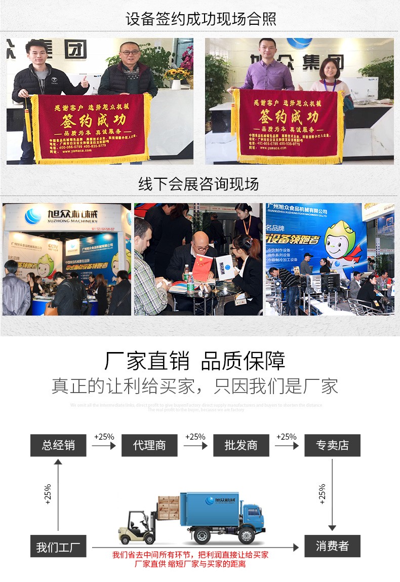 廣州旭眾食品機(jī)械有限公司是一家集科研開發(fā),生產(chǎn)設(shè)計(jì),營(yíng)銷服務(wù)為一體的現(xiàn)代化生產(chǎn)企業(yè)?,F(xiàn)代化生產(chǎn)車間,精湛制造技術(shù),所產(chǎn)機(jī)械歷經(jīng)市場(chǎng)重重考驗(yàn),不斷贏得海內(nèi)外客戶的贊譽(yù)。