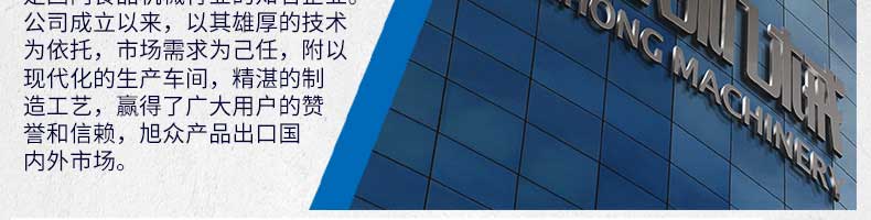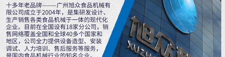 廣州旭眾食品機(jī)械有限公司是一家集科研開(kāi)發(fā),生產(chǎn)設(shè)計(jì),營(yíng)銷服務(wù)為一體的現(xiàn)代化生產(chǎn)企業(yè)?,F(xiàn)代化生產(chǎn)車間,精湛制造技術(shù),所產(chǎn)機(jī)械歷經(jīng)市場(chǎng)重重考驗(yàn),不斷贏得海內(nèi)外客戶的贊譽(yù)。