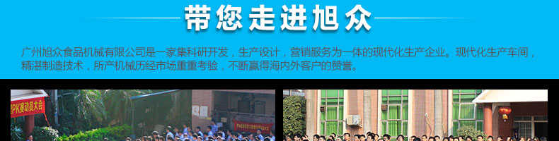 廣州旭眾食品機械有限公司是一家集科研開發(fā),生產(chǎn)設計,營銷服務為一體的現(xiàn)代化生產(chǎn)企業(yè)?,F(xiàn)代化生產(chǎn)車間,精湛制造技術,所產(chǎn)機械歷經(jīng)市場重重考驗,不斷贏得海內(nèi)外客戶的贊譽。