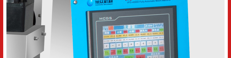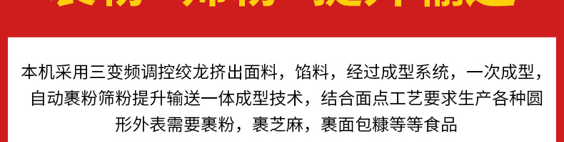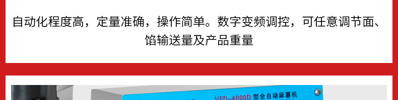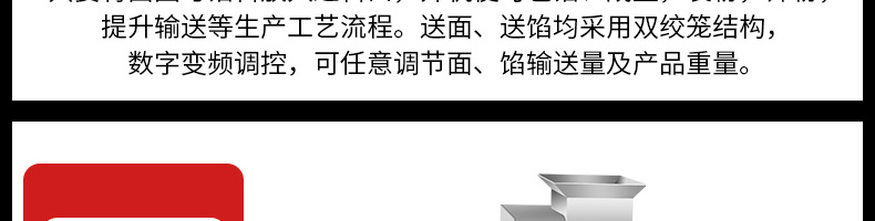 VFD-4000D麻薯機,操作簡單定量準(zhǔn)確只要將面團(tuán)與餡料放入進(jìn)料口,開機便可包餡、成型,裹粉,篩粉,提升輸送等生產(chǎn)工藝流程。送面、送餡均采用雙絞籠結(jié)構(gòu),數(shù)字變頻調(diào)控,可任意調(diào)節(jié)面、餡輸送量及產(chǎn)品重量。
