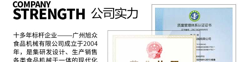 廣州旭眾食品機械有限公司是一家集科研開發(fā),生產(chǎn)設(shè)計,營銷服務(wù)為一體的現(xiàn)代化生產(chǎn)企業(yè)?,F(xiàn)代化生產(chǎn)車間,精湛制造技術(shù),所產(chǎn)機械歷經(jīng)市場重重考驗,不斷贏得海內(nèi)外客戶的贊譽。