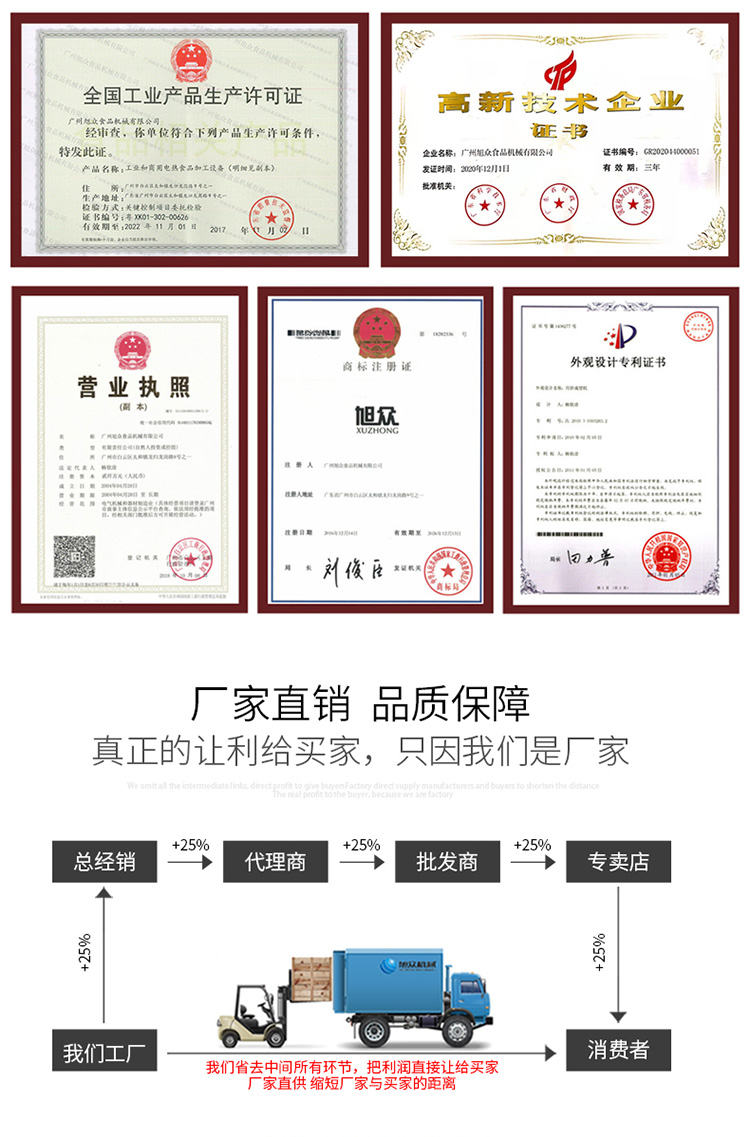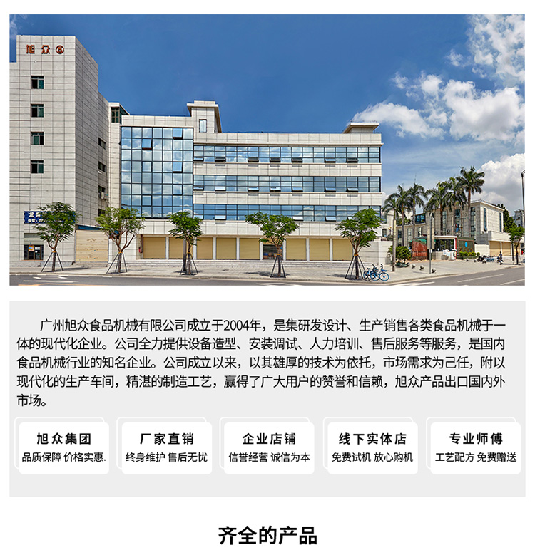 廣州旭眾食品機械有限公司是一家集科研開發(fā),生產(chǎn)設(shè)計,營銷服務為一體的現(xiàn)代化生產(chǎn)企業(yè)?,F(xiàn)代化生產(chǎn)車間,精湛制造技術(shù),所產(chǎn)機械歷經(jīng)市場重重考驗,不斷贏得海內(nèi)外客戶的贊譽。