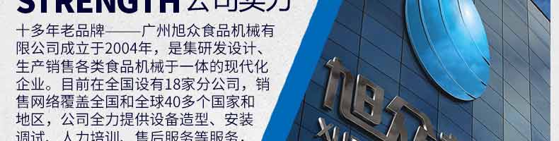 廣州旭眾食品機械有限公司是一家集科研開發(fā),生產(chǎn)設(shè)計,營銷服務(wù)為一體的現(xiàn)代化生產(chǎn)企業(yè)。現(xiàn)代化生產(chǎn)車間,精湛制造技術(shù),所產(chǎn)機械歷經(jīng)市場重重考驗,不斷贏得海內(nèi)外客戶的贊譽。