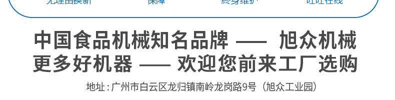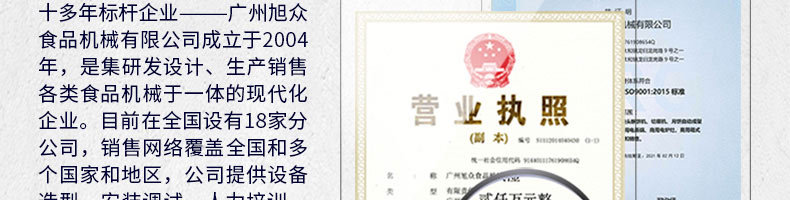 廣州旭眾食品機(jī)械有限公司是一家集科研開發(fā),生產(chǎn)設(shè)計(jì),營(yíng)銷服務(wù)為一體的現(xiàn)代化生產(chǎn)企業(yè)?,F(xiàn)代化生產(chǎn)車間,精湛制造技術(shù),所產(chǎn)機(jī)械歷經(jīng)市場(chǎng)重重考驗(yàn),不斷贏得海內(nèi)外客戶的贊譽(yù)。