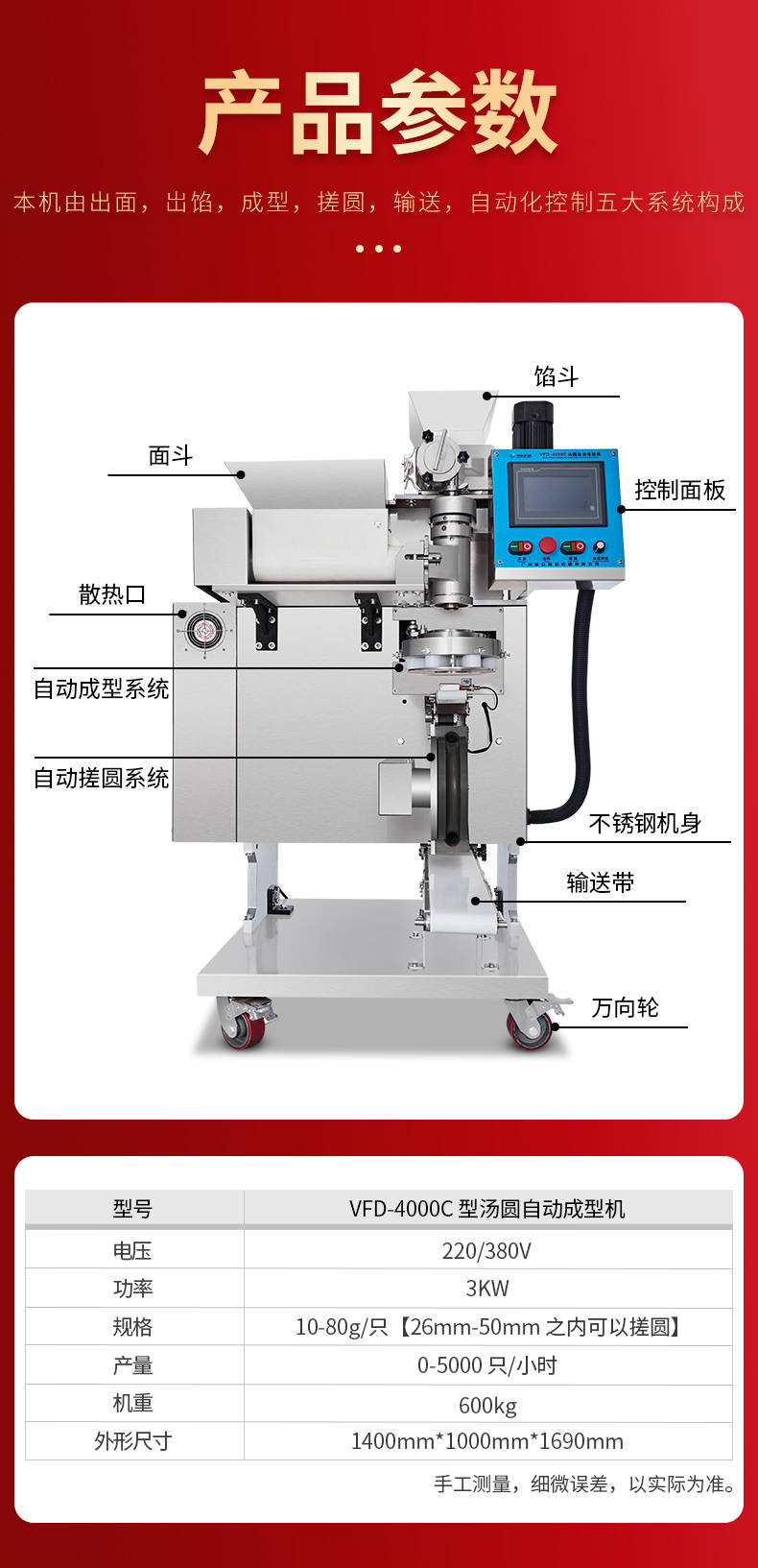 VFD-4000型湯圓自動(dòng)成型排盤(pán)一體機(jī),本機(jī)依外皮及餡料的種類(lèi)不同,可制作湯圓、豆沙包、南瓜餅、奶黃包、含餡饅頭、玉兔包等包餡食品的設(shè)備。工作效率高、相當(dāng)于8-12個(gè)工人同時(shí)制作湯圓,真正低收入、高收效、省錢(qián)省工。適合用于各種工作場(chǎng)所。免費(fèi)上門(mén)安裝,贈(zèng)送工藝