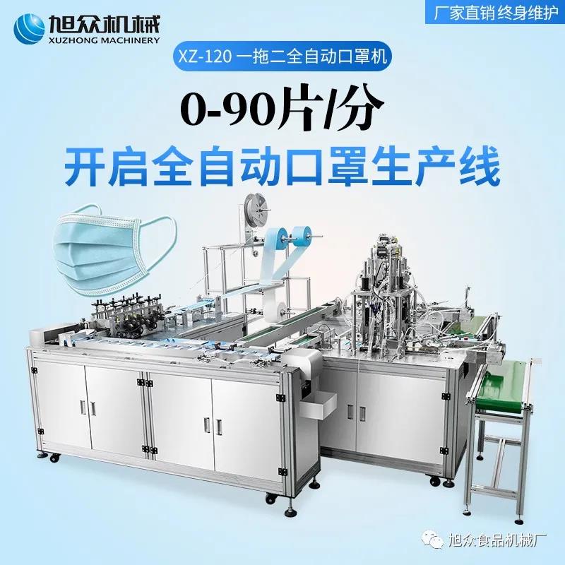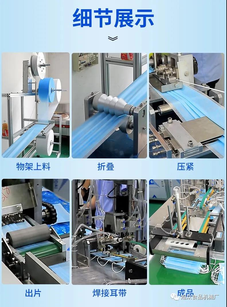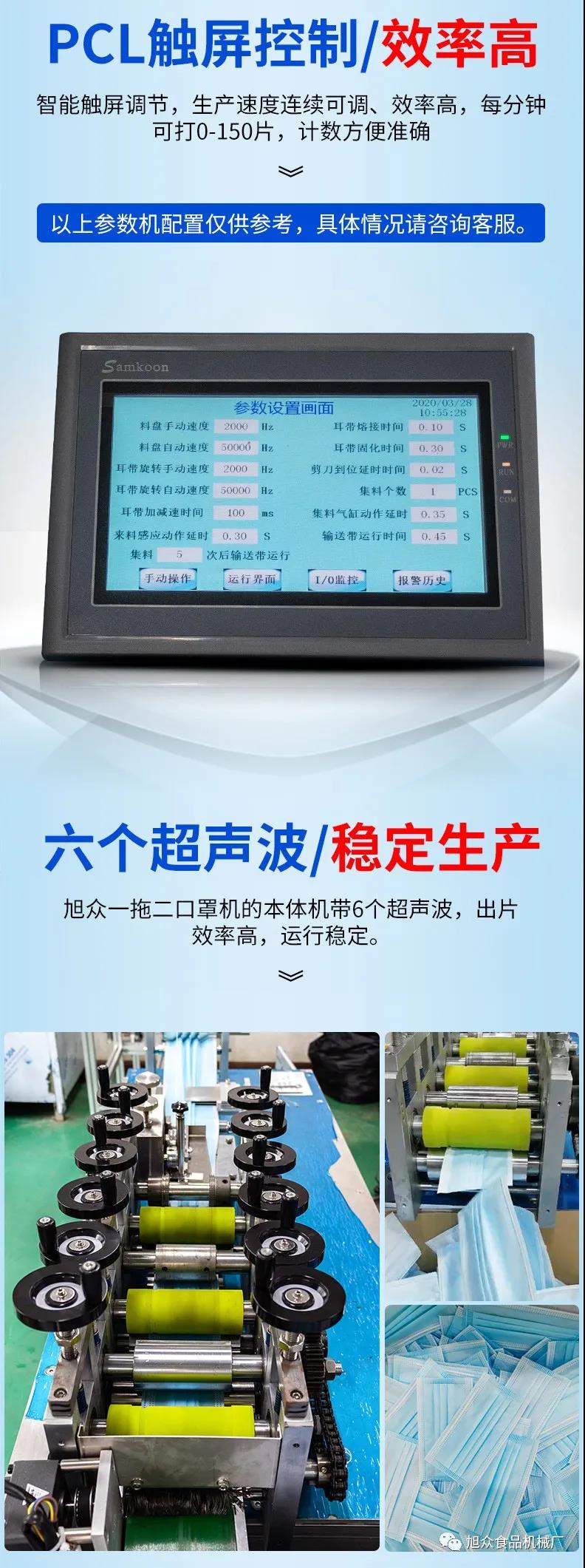 旭眾牌一拖二口罩機由一臺本體機帶動兩臺耳帶機組成。本體機輸出ロ罩本體后,由輸送帶結構將口罩本體片輸送到連接耳帶機的輸送帶上,再通過輸送帶將口罩片輸送到耳帶機的正面第一個口罩盤上方,最后通過氣缸下壓把口罩片放置到耳帶機的口罩盤內(nèi),后續(xù)由耳帶機完成口罩的耳帶熔接,包邊等動作,從而完成一個耳帶口罩產(chǎn)品的生產(chǎn)。本機采用PLC、觸摸屏控制、主傳送帶采用單相馬達輸送、步進馬達翻轉,傳動精確,控制穩(wěn)定,速度可調。