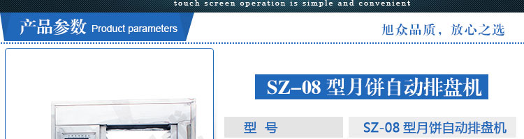 SZ-08型月餅自動排盤機,可同于制作各種月餅。適用于蛋糕房、休閑食品廠、食品加工產(chǎn)、面包房、月餅加工廠、超市、學(xué)校、食堂等各種工作場所??蓾M足不同客戶群體。免費提供工藝技術(shù)。